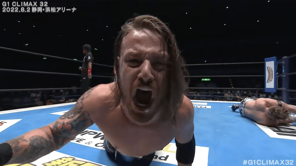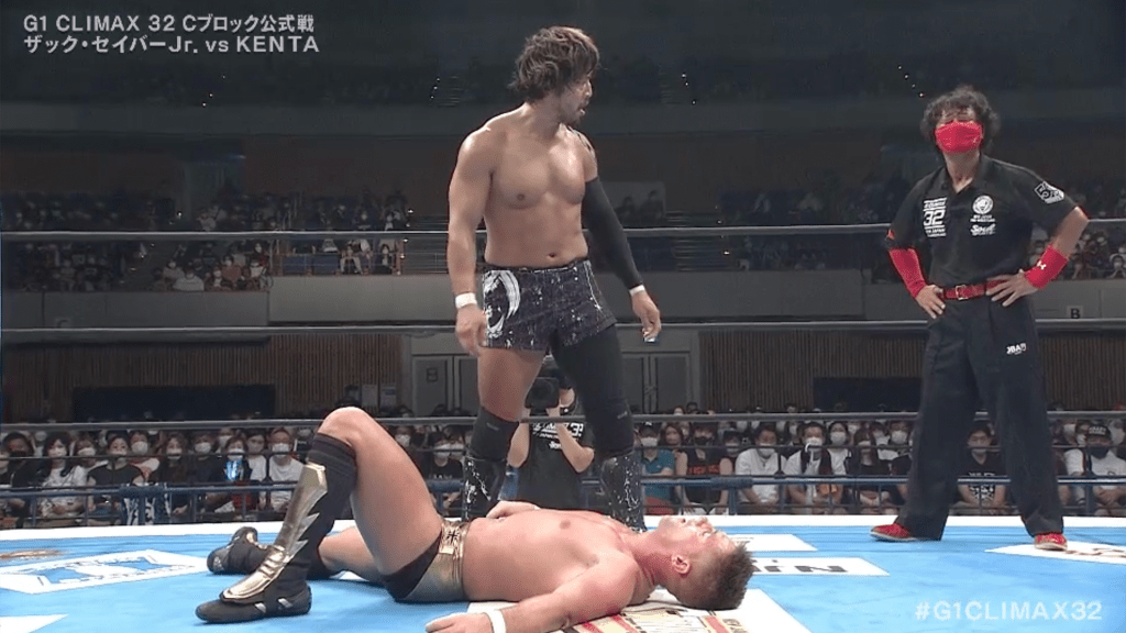 KENTA takes a break from slapping Zack Sabre Jr.’s face off during their G1 Climax 32 bout. | New Japan Pro Wrestling image via njpwworld.com New Japan Pro Wrestling
